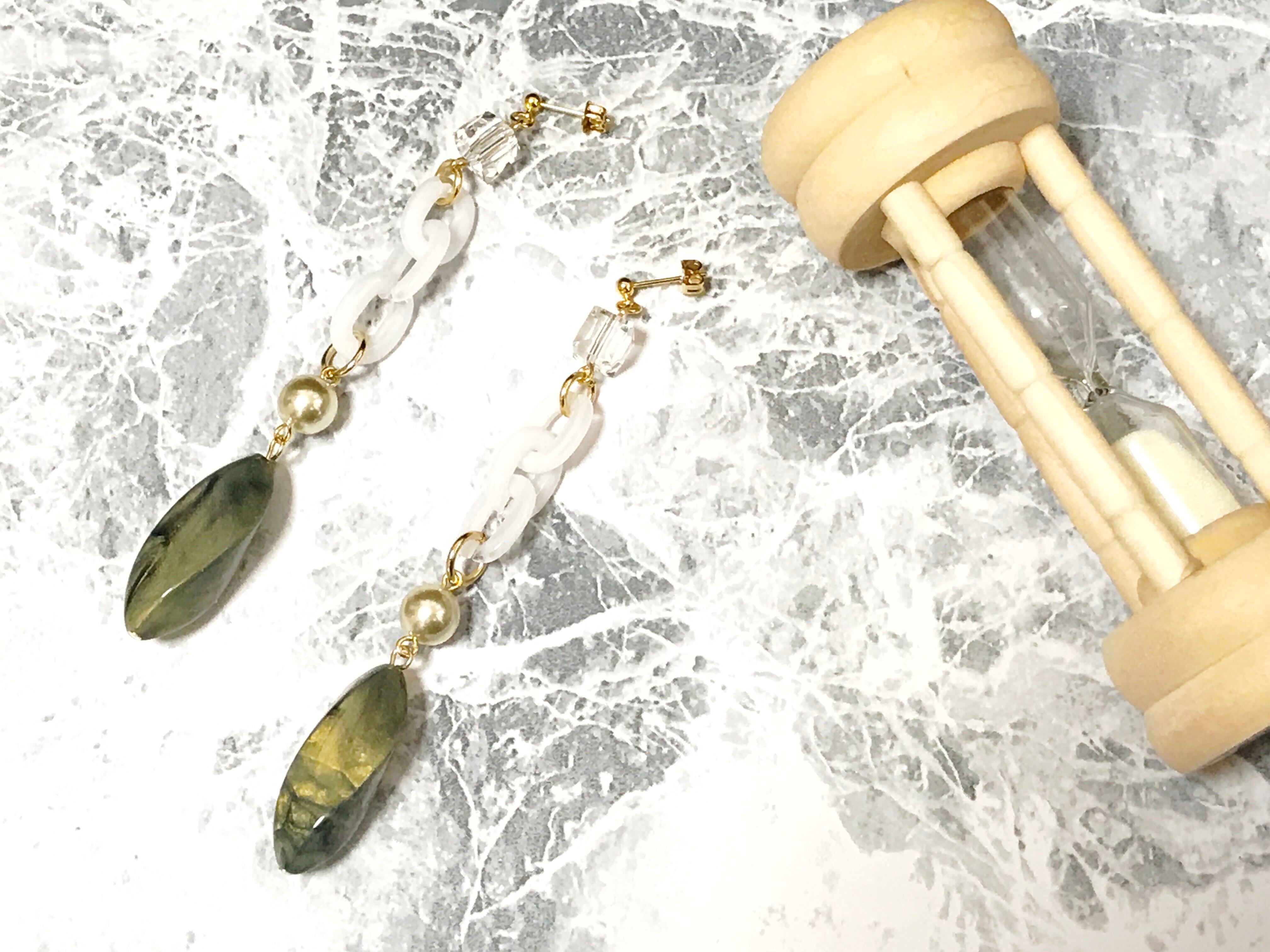 ダークグリーンとホワイトのコントラストが美しいデザインのピアス。