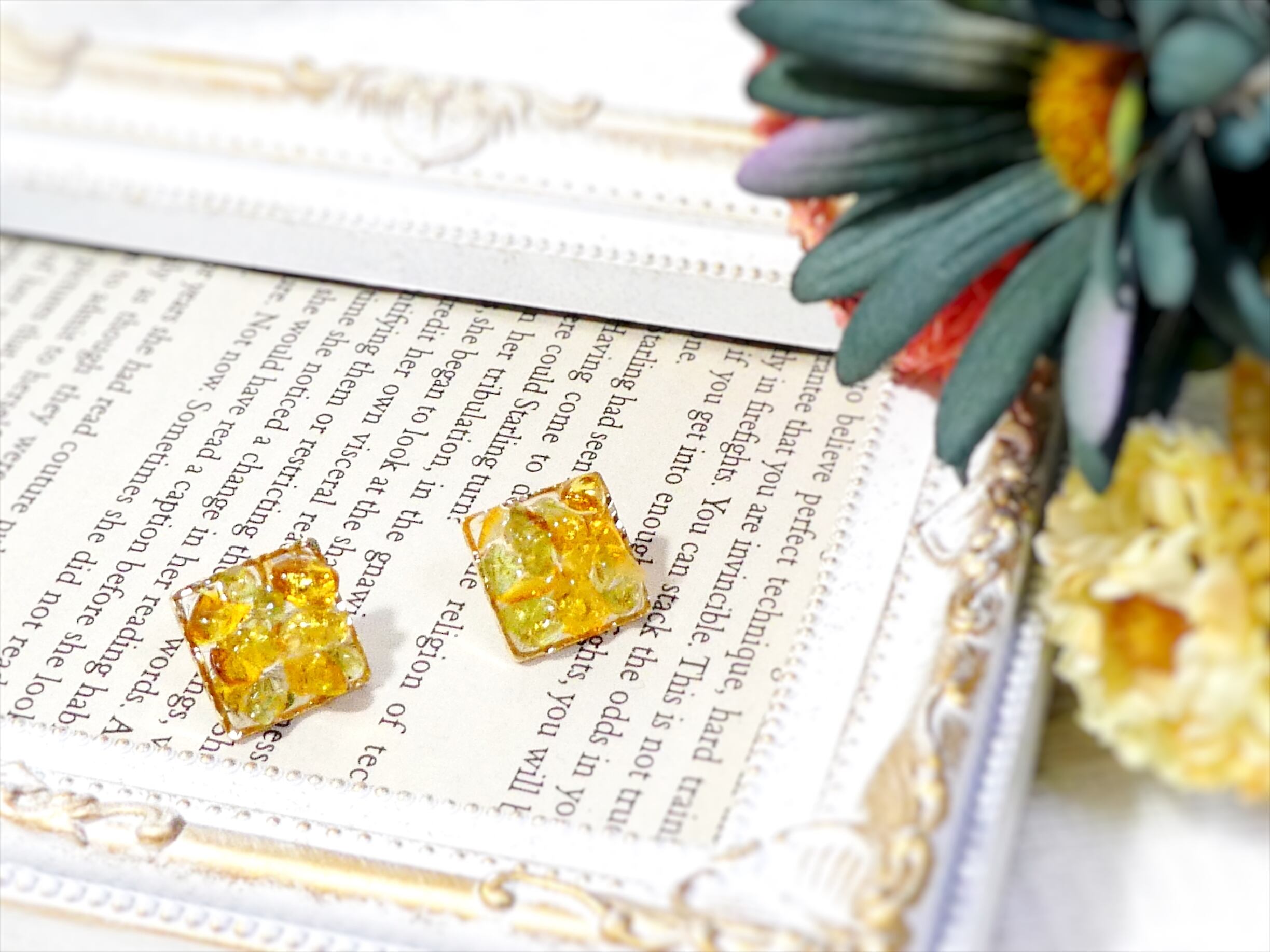 四角のフレームに細石を詰め込んだ、これからの時期におすすめのピアス。