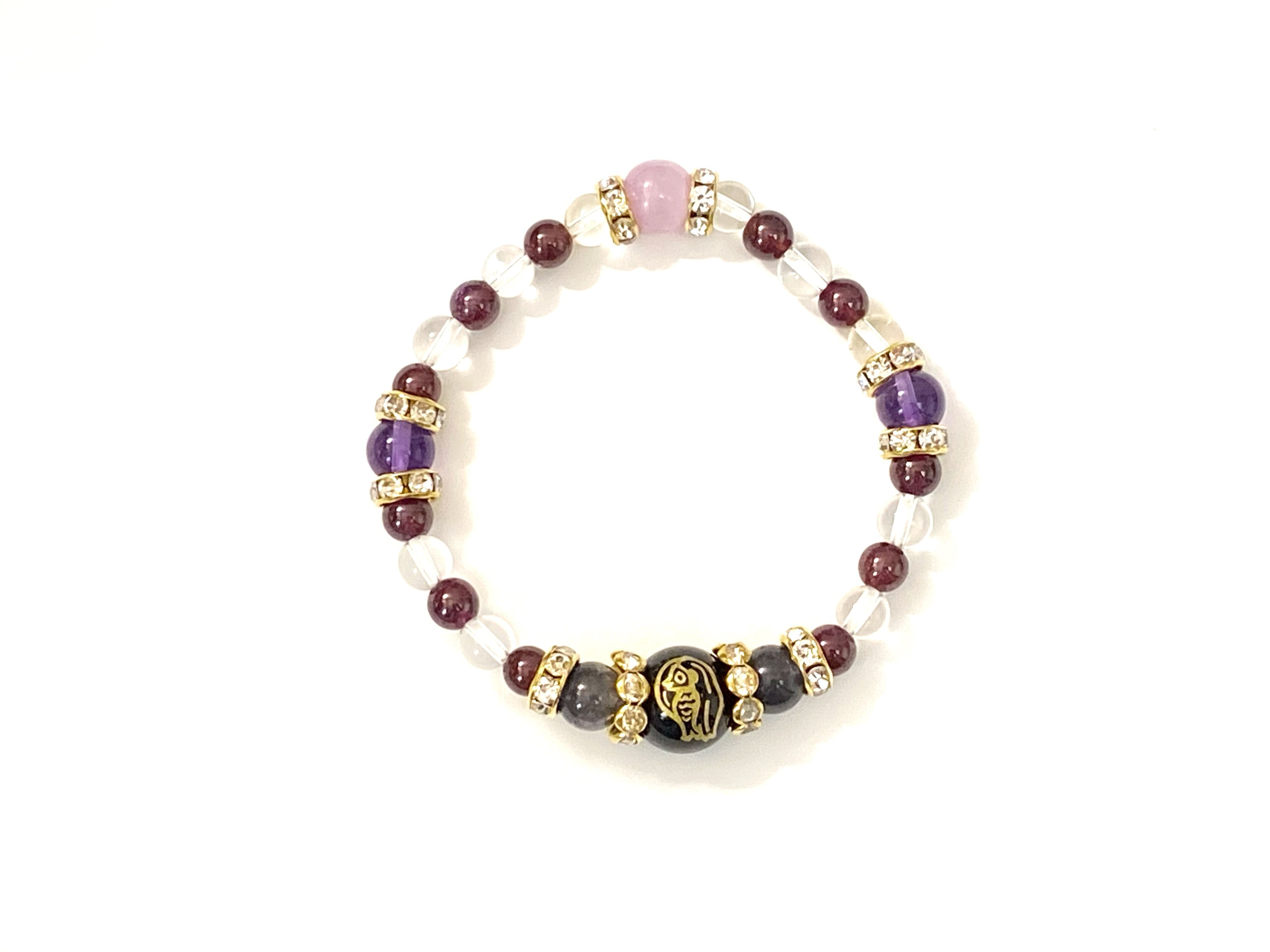 5Aアメジスト、クリスタル、ロードナイトガーネット、アイオライト、クンツァイトの上質な天然石を組み合わせたアイテム。